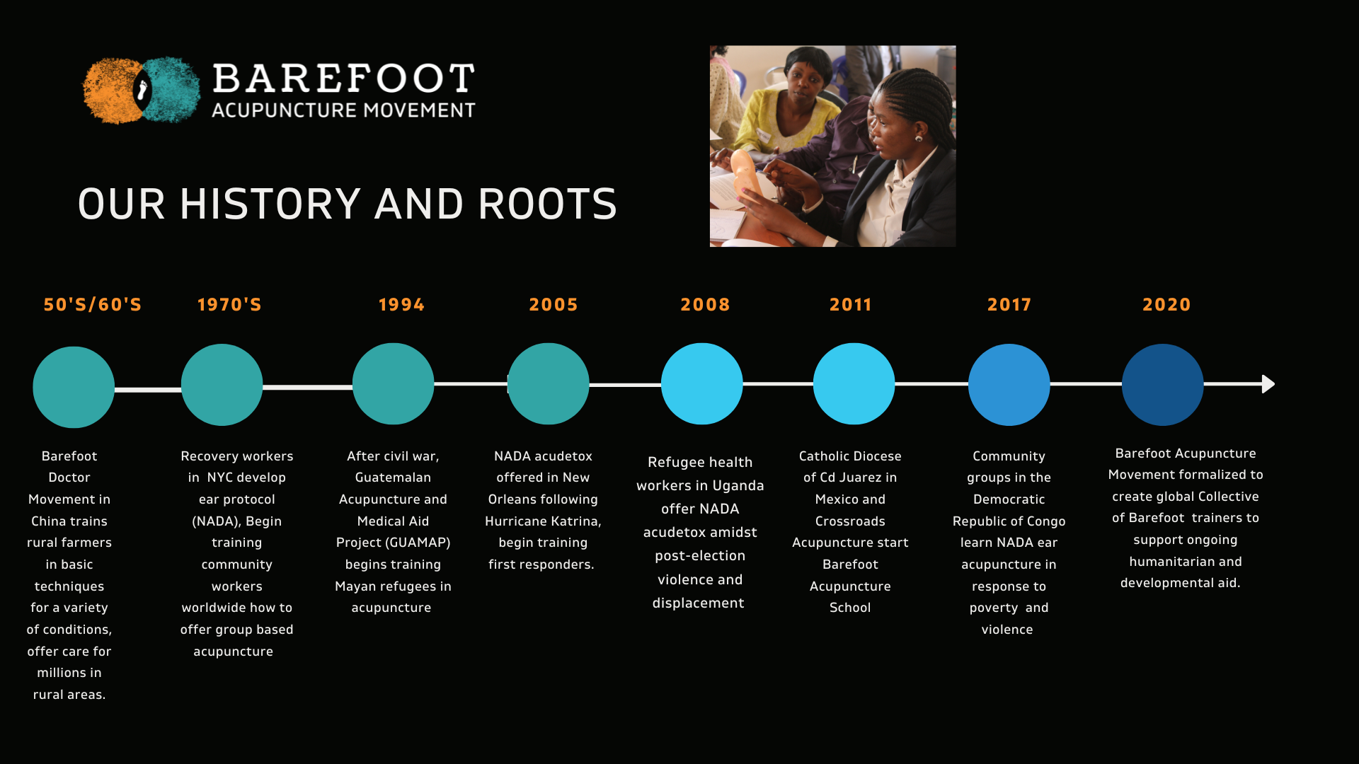Acupuncture as “Barefoot” means ``feet`` on the ground. It means that people on the ground in a given place are able to offer care for their own community. Our model strives to make acupuncture as a preferential option for the poor. The Barefoot Doctor movement in China trained community health workers in rural and underserved areas, who offered care for millions of people, in regions where urban-trained doctors would not work. Over the past 50 years, a variety of global health programs have cultivated this model of training the people within addictions recovery and humanitarian aid and development. The Barefoot Acupuncture Movement draws on these projects, putting acupuncture into the hands of people on the front lines of justice and healing.